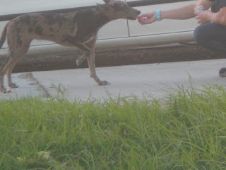 MERYL es una perrita preciosa, cariñosa, tímida, jovencita. Está hambrienta, sedienta, asustada y con una pata inflamada, que lleva encogida y le duele.